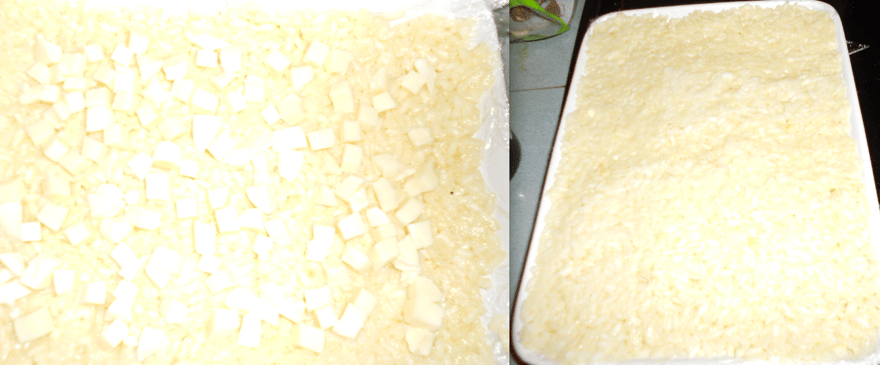 -Spread a 1-inch thick layer of risotto into a baking dish (if it isn’t non-stick, I suggest greasing it first). Add a layer of mozzarella cut into ¼ inch cubes. Cover the mozzarella with another 1-inch layer of risotto and pack it tightly. Wrap the dish in plastic wrap and refrigerate until firm. (It will take about an hour to firm up, but again, this can be done the day before your partay if you wish.)