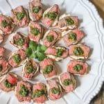 Beef Tenderloin Crostini with Whipped Goat Cheese and Pesto: (Serves 8)