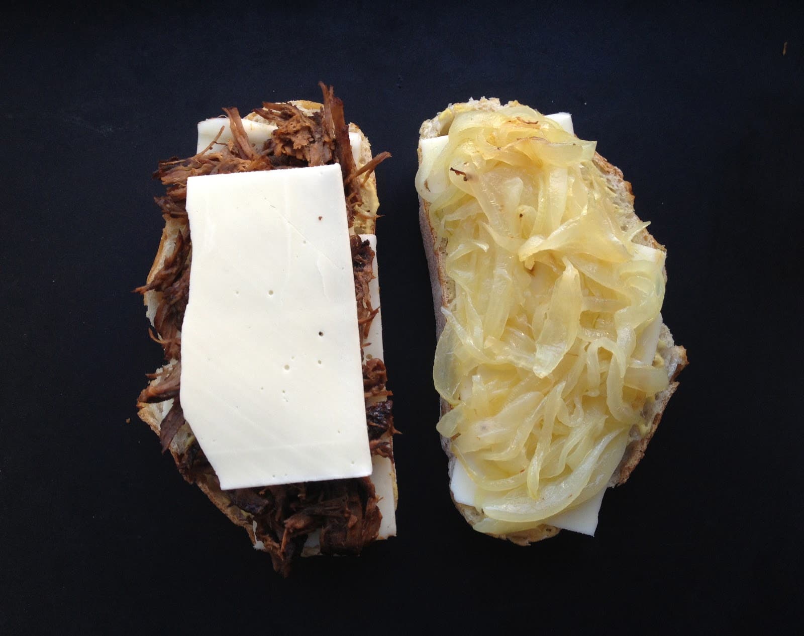 - When your meat is shredded and your onions are caramelized, you can start assembling your epic grilled cheese. For each sandwich, you will need 2 slices of bread (duh). I used a roasted garlic French loaf, but you can use whatever bread floats your boat. If your are using a loaf, you will want to cut it into ¾ inch slices. Spread the inside of both slices with ½ tsp Dijon mustard.