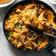 Made this gluten free with Jovial egg tagliatelle and subbed cornstarch for the flour dredge. Not a last-minute, quick prep dinner, but oh my, it is worth the work. Fresh and incredibly flavorful, so much more than I was expecting from chicken pasta. We both took one bite and made a shocked face at how good it was. Made it for the second time tonight. Will not be the last.