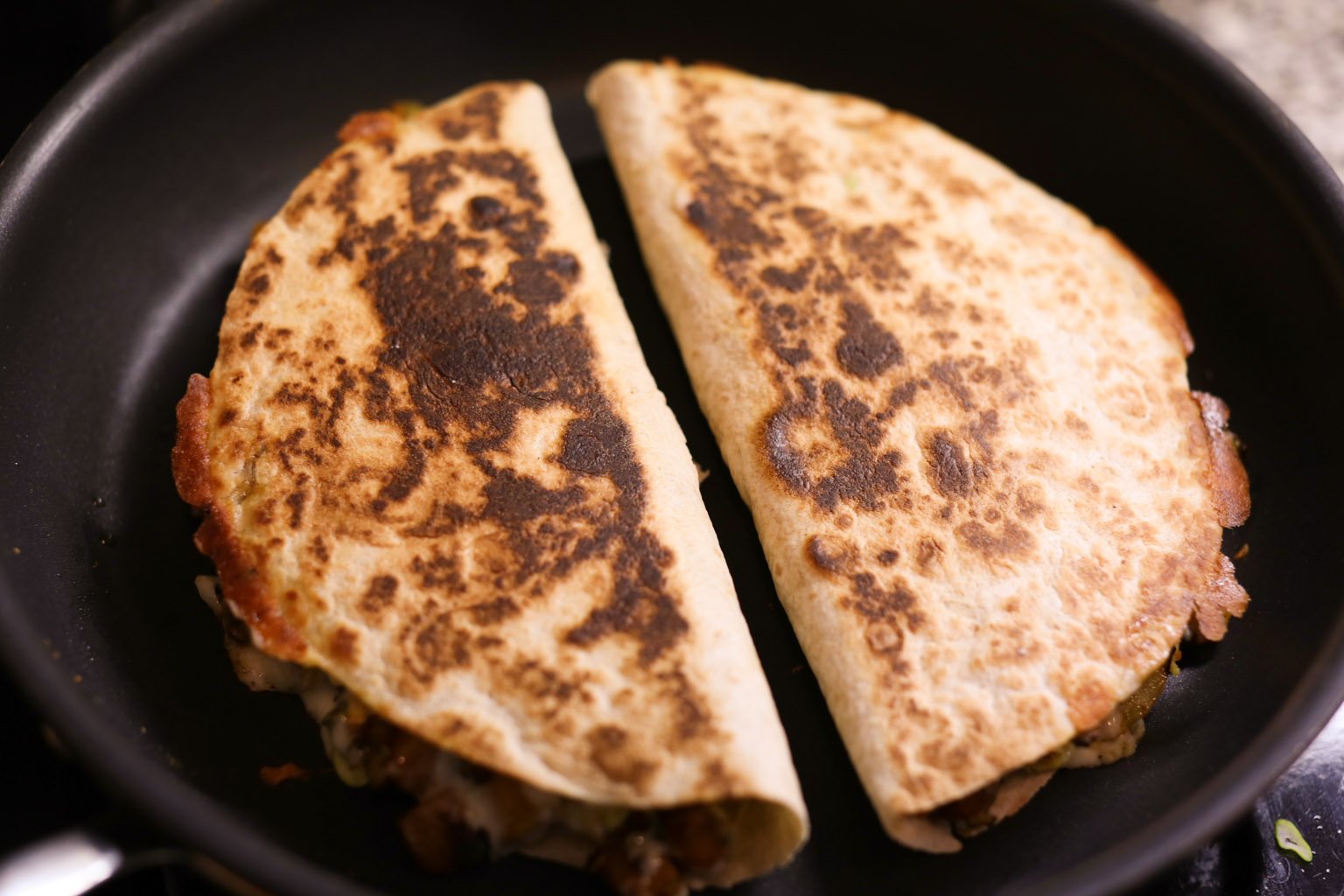 - Wipe out the pan one last time and return it to the stovetop over medium heat. When hot, add two quesadillas to the pan and cook for 2 to 3 minutes or until the underside of each tortilla is lightly browned and crispy. Flip them carefully and cook for another 2 minutes on the opposite side, then transfer to a cutting board. Repeat this process with the remaining queadillas.
