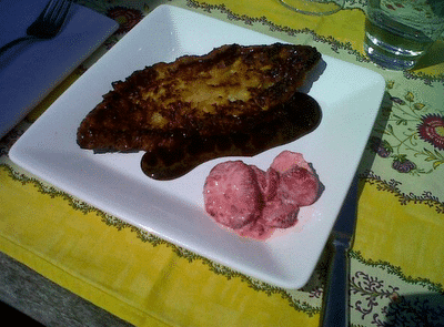 Apparently people in France don’t eat maple syrup, or at least you can’t buy it in the grocery stores. Serena prefers the fancy shmancy pure maple syrup from New Hampshire, or whatever little state that stuff comes from. I, however, was raised on Aunt Jemima’s “comes-in-a-plastic” bottle syrup in in Miss-ur-ah. SO DELICIOUS. This is irrelevant since neither is available in France. I decided to try to make a simple syrup to compensate, but it didn’t go so bueno. Who knew hardened caramel was so hard to scrape off plates? So, if for some crazy reason you don’t have maple syrup in your cupboard when you are scrambling for Sunday brunch, just use powdered sugar. Trust me.