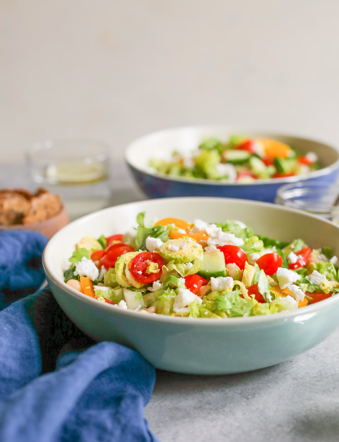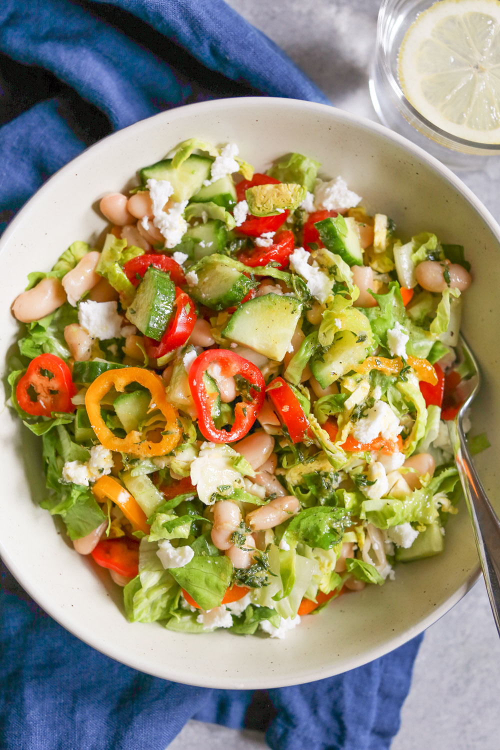 Given that most humans are on a clean(ish) eating streak right now, I thought this fresh chopped salad would be an appropriate first recipe of the year. It’s light, fresh, and packed with nutrients, but it also knocks it out of the flavor park, which is crucial. I call it a “clean out the fridge” salad because it’s more of a template for an epic salad than a strict recipe. I’m particularly fond of the cannellini bean and veggie combo here, but you can easily sub whatever ingredients you happen to have on hand. In short, you’ll need 2 cups chopped lettuce, 1 cup beans, 4 cups chopped veggies of your choice, and an optional sprinkling of cheese. Toss everything with a super simple lemon-thyme dressing, and BOOM. Done.