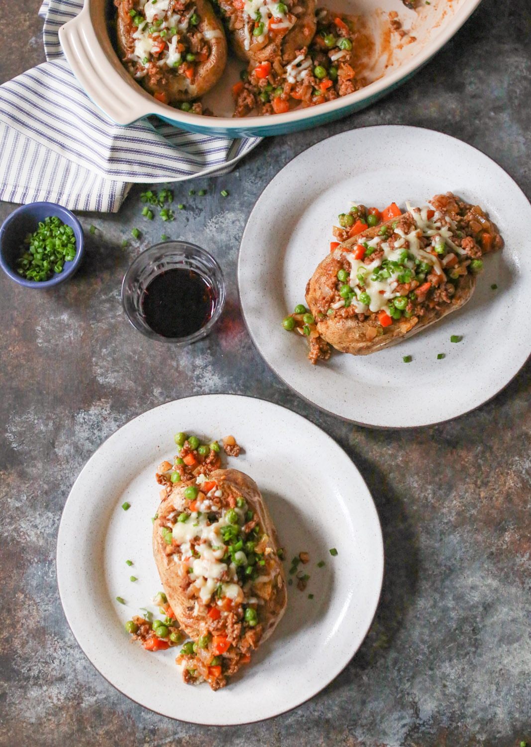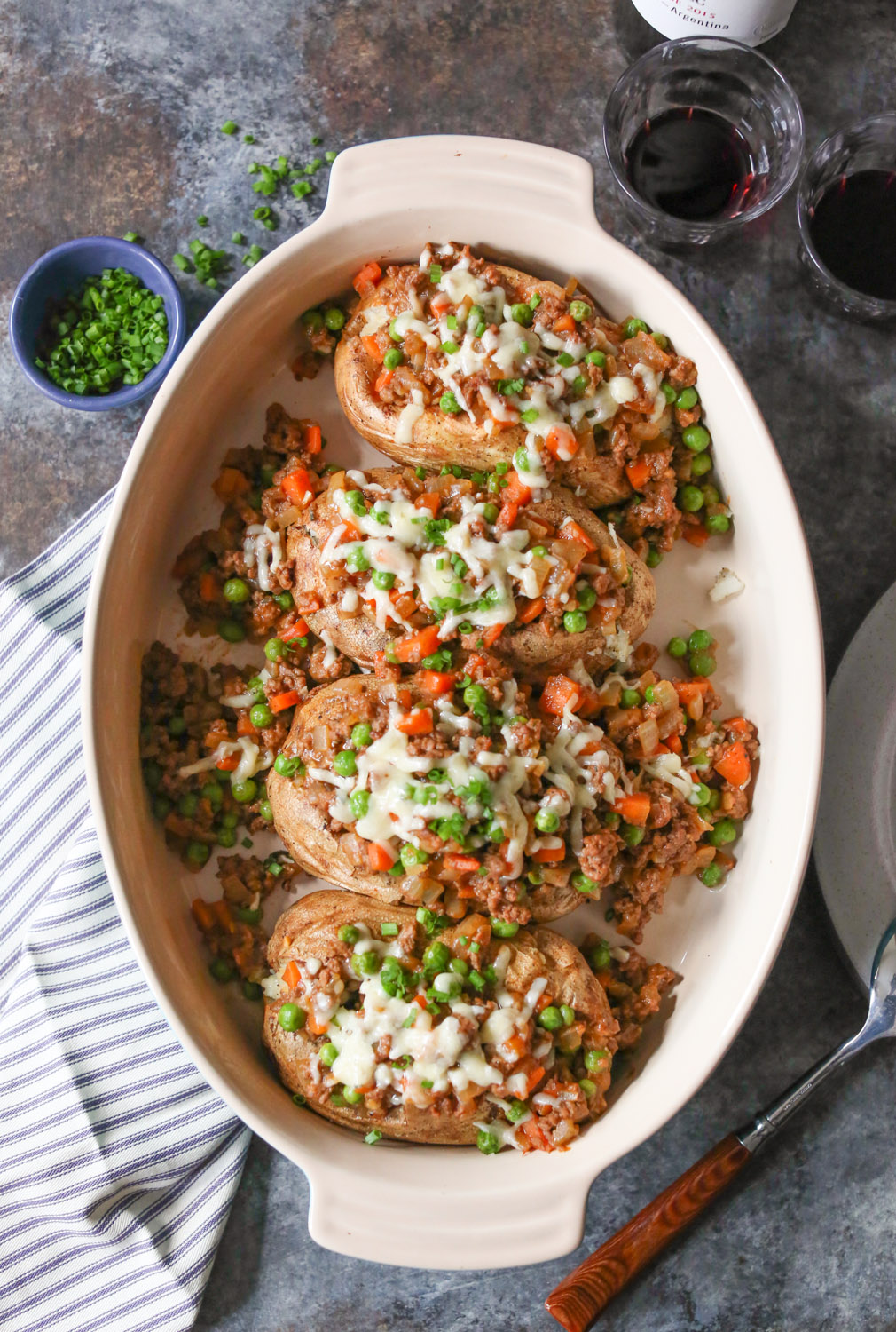 - Split the baked potatoes almost in half lengthwise (you still want them to remain intact on their undersides), drizzle the inside of each with a teaspoon of olive oil, and sprinkle with salt and pepper. Roughly mash the flesh with a fork. Fold a tablespoon of Gruyère into each potato’s mash. Load each potato with a quarter of the beef filling (some will come out the sides, and that’s okay!) and top with the remaining cheese. Return to the oven for 5 minutes just until the cheese has melted. Serve warm.