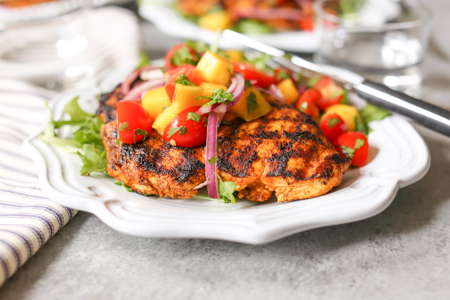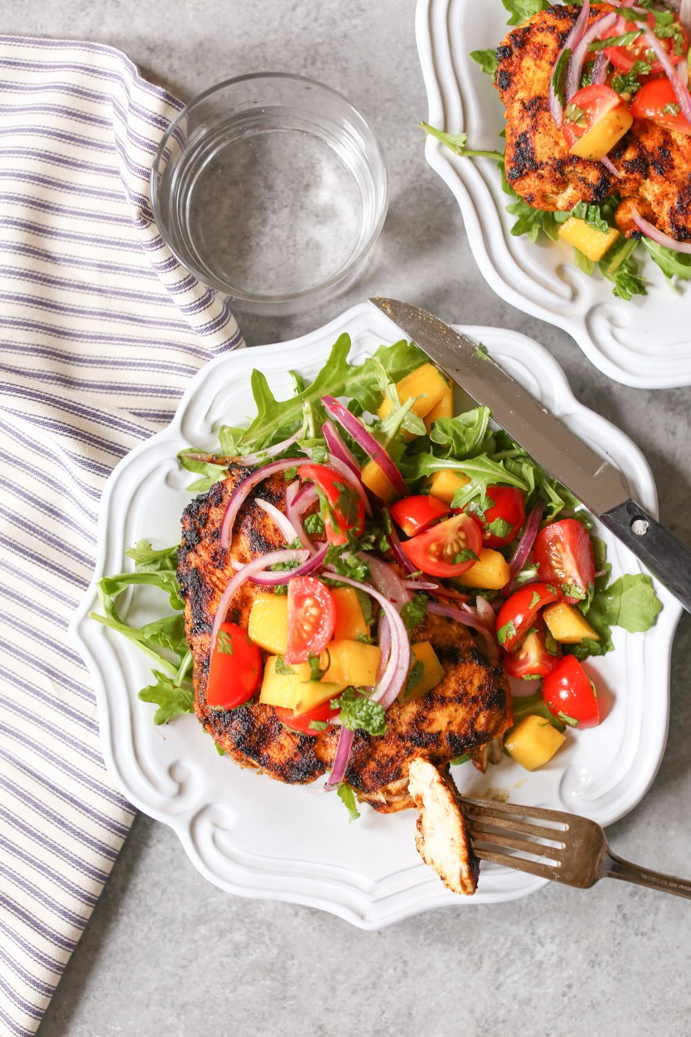 This is my favorite marinated and grilled chicken recipe for the summer — it is SO freakin’ good. I would never have thought to use this combo of spices for a marinade but wow do they pack a punch. I’ll usually let this marinade for at least an hour and sometimes I’ll make extra so I can use the chicken on salads throughout the week. The relish is so fresh and delicious as well. If I can’t find ripe mango, I’ll buy and drain the mango chunks (in 100% juice) from the store and they work great too. This recipe is a hit with everyone I’ve made it for — try it out!