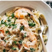 This recipe is really best with the cream in to get the right texture and consistency. Without the cream, this will be closer to a shrimp scampi kind of vibe! If you wanted a lighter option, you could swap the cream for half and half if you’d prefer.