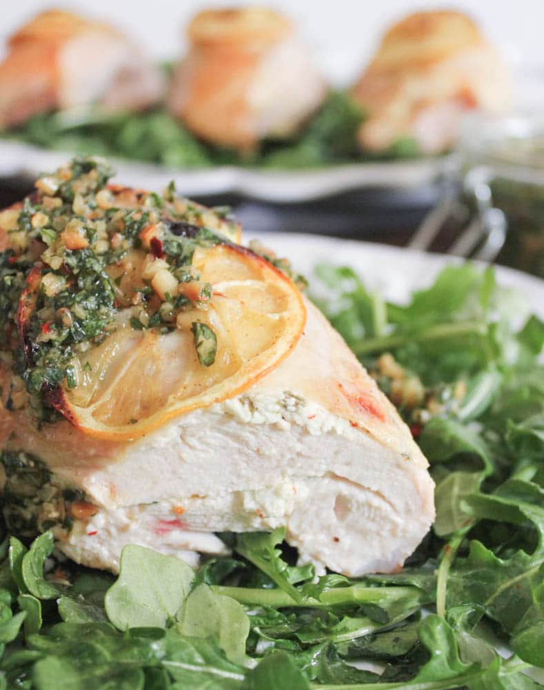 - Serve your goat cheese stuffed chicken breasts topped with rustic basil pesto.