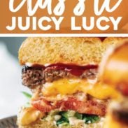JUICY LUCY! A delicious hamburger stuffed with molten, bubbly, waterfalling cheese, all piled on a buttery toasted bun with all the fixings. The BEST.