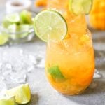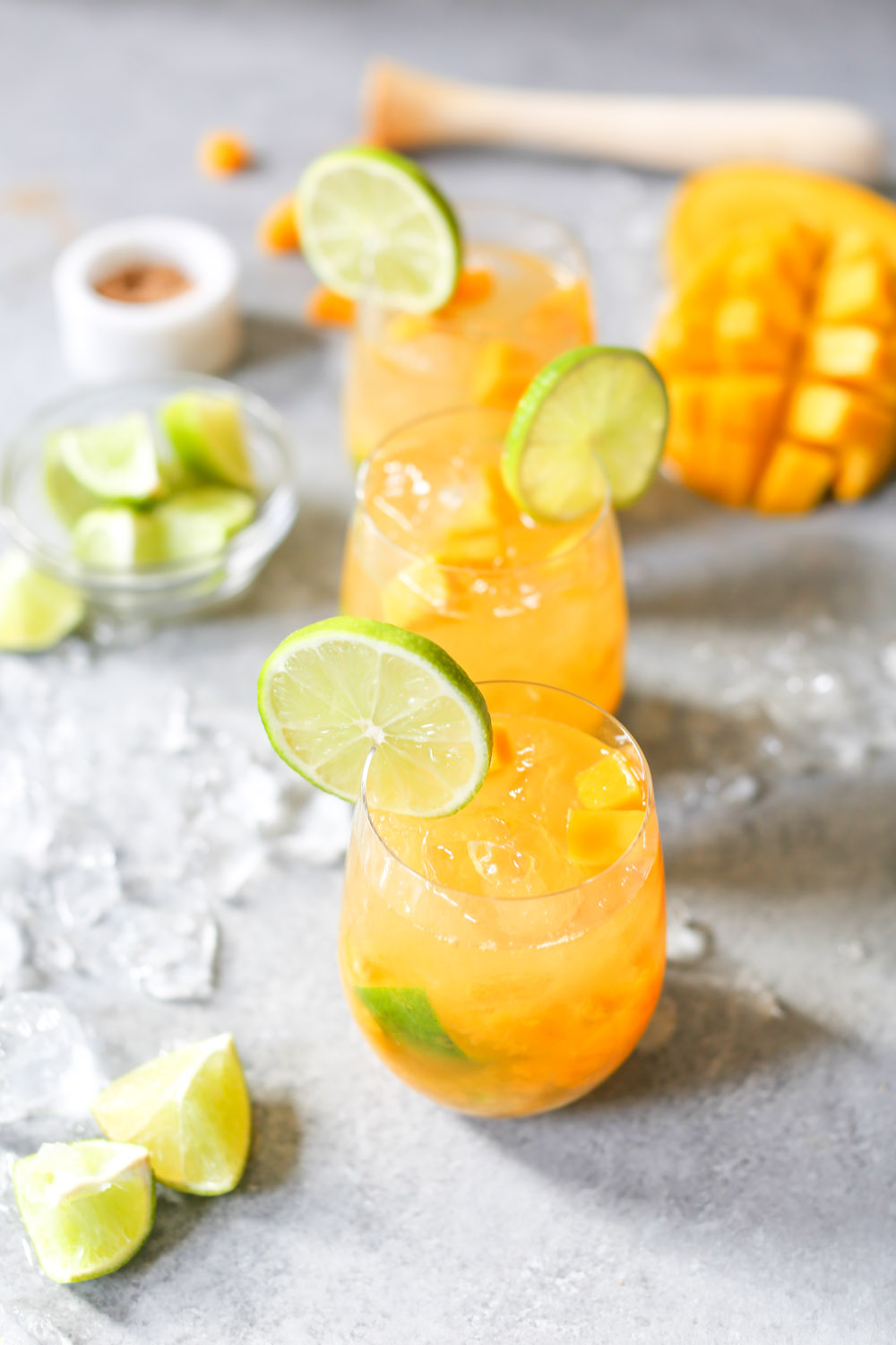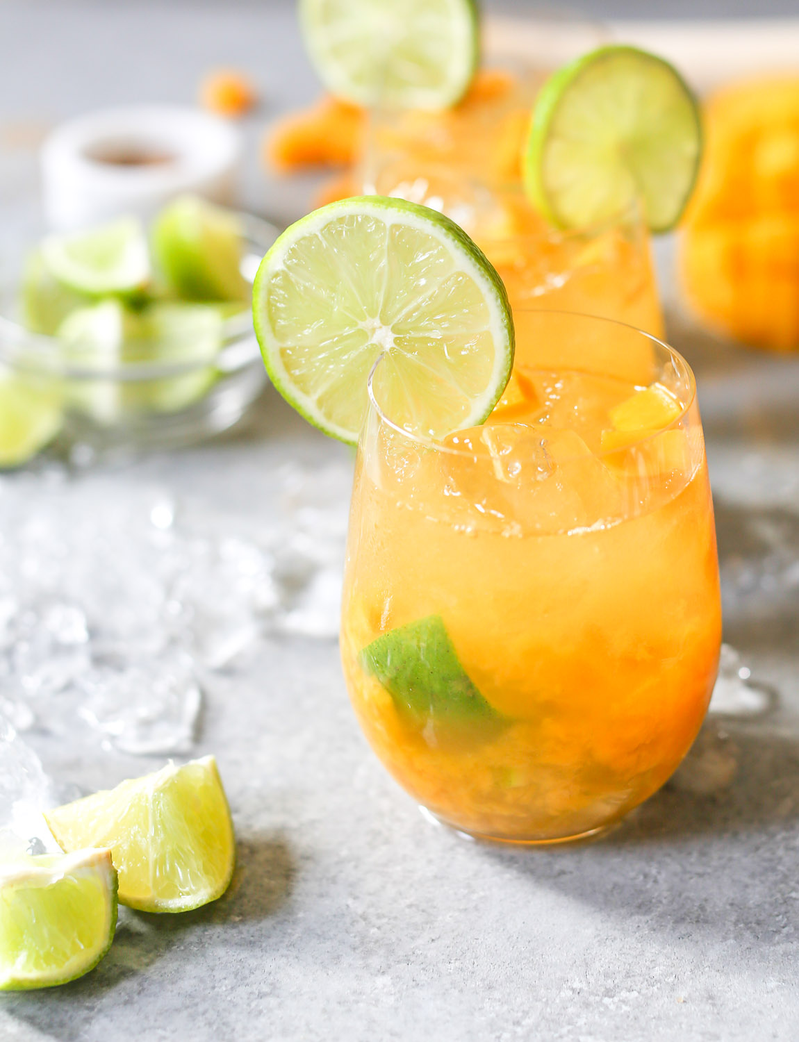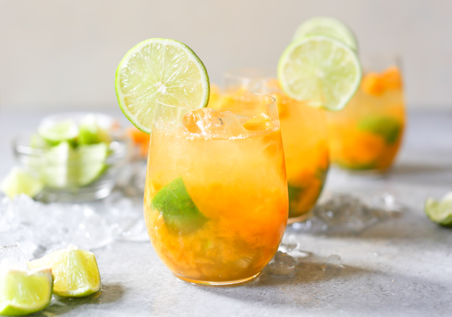 - In a rocks glass, muddle the lime quarters, mango, and sugar. (Don't go too crazy, people. If you over muddle the limes, your drink will taste bitter.)