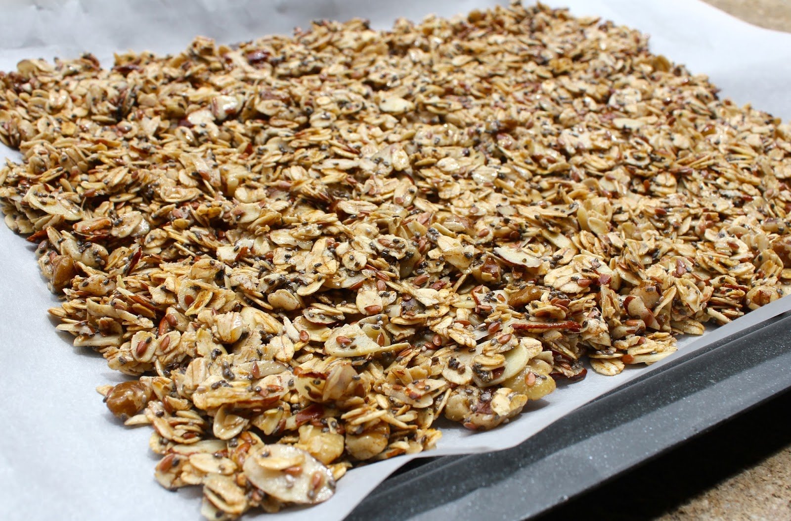 The best part about Maple Cinnamon Granola is that it’s bursting with health benefits. First of all, I used coconut oil instead of butter or vegetable oil. If you aren’t familiar with coconut oil, it’s the tits, and it has been proven to boost weight loss, immunity, digestion and metabolism. Its flavor is very subtle, so chances are that you’ll like it even if you’re not a coconut fan. Next, you’ve got flaxseeds and chia seeds, which are tiny superfoods packed with omega-3 fats and fiber. These seeds are praised for their ability to boost energy, lower cholesterol, regulate appetite and improve mood, which is good news for everyone. This granola also has plenty of protein and healthy fat from the almonds and walnuts, and there is no refined sugar. Long story short, eating this granola will make you thinner, happier, and more energetic. Boom.