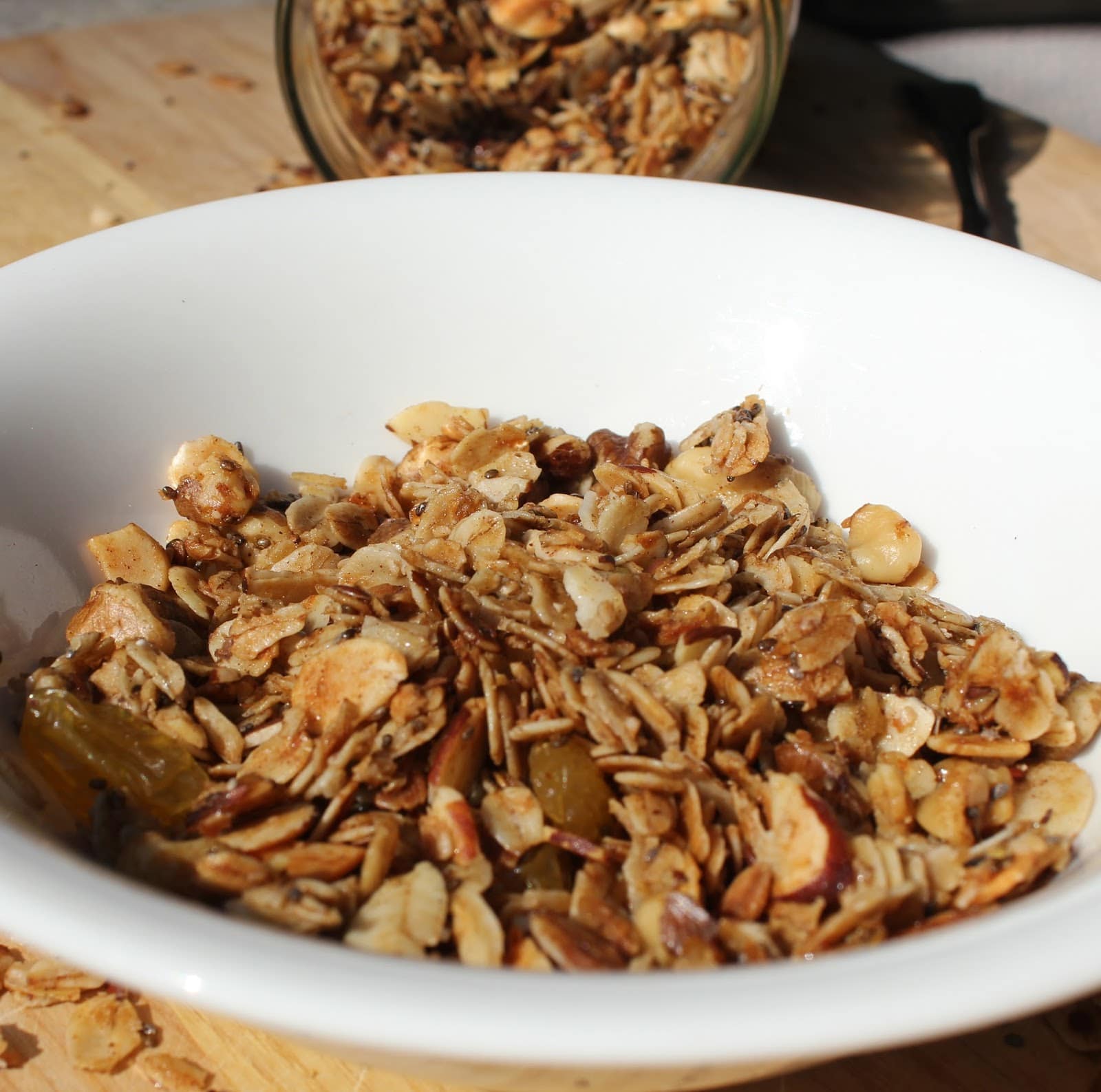 Maple Cinnamon Granola is everything that you want in a granola. Oats, flaxseeds, chia seeds, almonds, and walnuts are tossed with cinnamon, nutmeg, coconut oil and maple syrup and then baked until beautifully golden and crisp. The granola is nutty and cinnamon-y with a light maple glaze and a hint of salt, which strikes the perfect balance of sweet and savory. It has just the right amount of crunch, and plump golden raisins add a nice textural contrast and extra sweetness. If nothing else, Maple Cinnamon Granola is worth making simply based on how unbelievably delicious your house will smell while it’s in the oven. (I felt like I was living in a cloud of snickerdoodles and fresh pancakes for like two hours yesterday.)