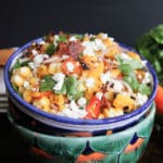 - Transfer the corn salad to a serving bowl/platter and top with cheese. (You can also mix the cheese in if you like.) Serve at room temperature or chilled.