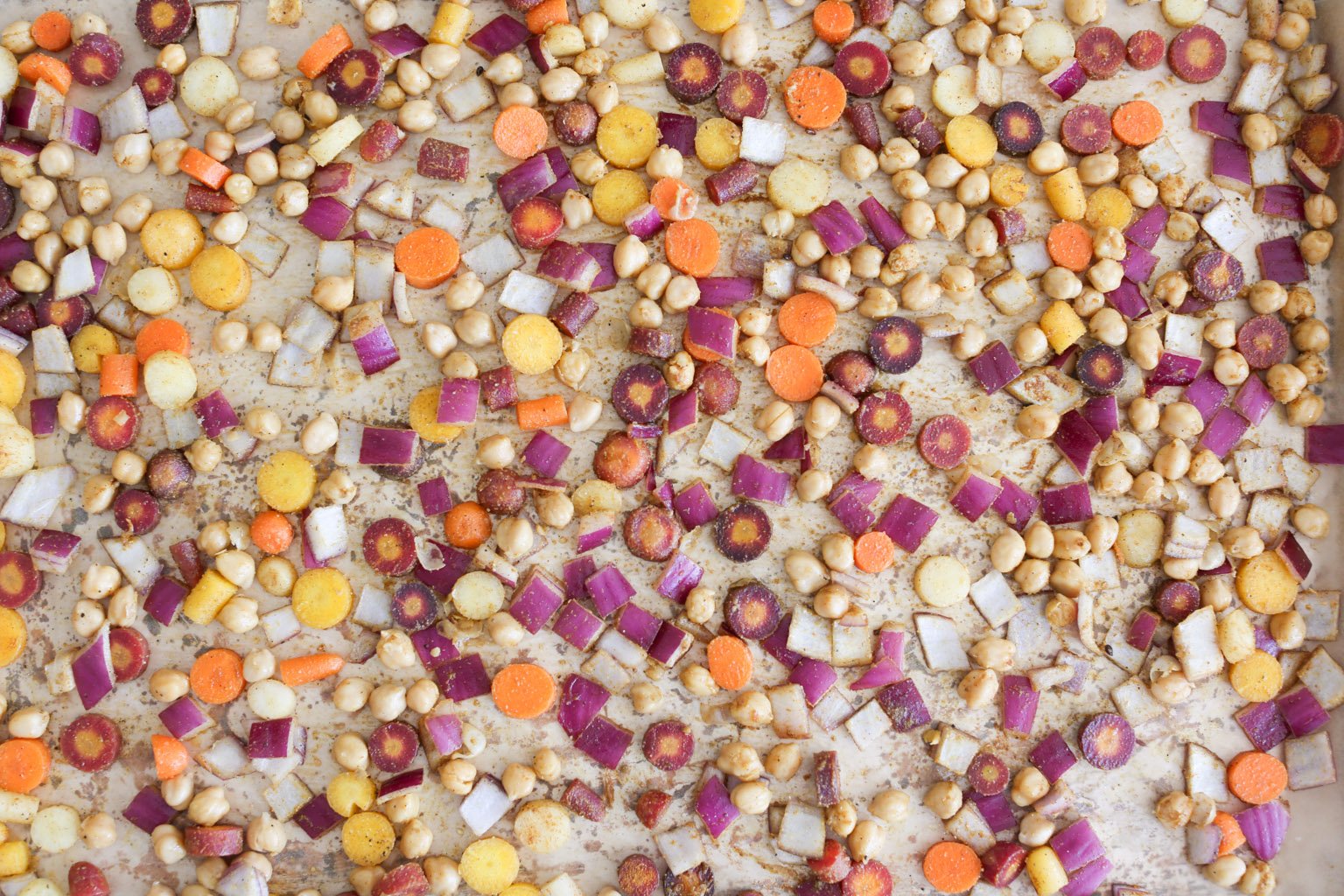 -Pre-heat the oven to 425 degrees. Line a rimmed baking sheet with parchment and set aside. Cut the carrots into ¼-inch rounds, and place them on the baking sheet along with the onion, chickpeas, and coconut oil. Toss well and add the spices, salt, and pepper.
