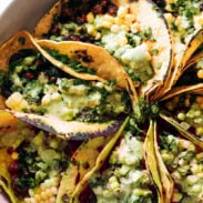 As with all tacos, please, by all means, go big with your toppings. You know I will approve of the more-is-more mentality here. For one, I can confirm that avocado is killer. Slaw or some kind of pico would be excellent. Pickled red onions would truly make the angels sing. And the sweet corn that I generously scooped all over my tacos was a peppy nod to summer and all things sweet, fresh, and a little bit crunchy.