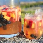 Whipping up a pitcher of Sparkling Sangria is a breeze. All you have to do is toss the fruit in the pitcher with some sugar and orange liqueur and let it macerate for 45 minutes. The berries and peaches will soften slightly and release their juices, which serves as the pretty and delightfully fresh base of this sparkling cocktail. Just pop the champagne before serving, pour it over the macerated fruit and serve your sangria over ice.