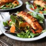 - Add half of the remaining dressing to the salad and toss to coat. Divide the salad amongst plates and top each with a salmon filet. Serve with the remaining dressing to drizzle over the fish.
