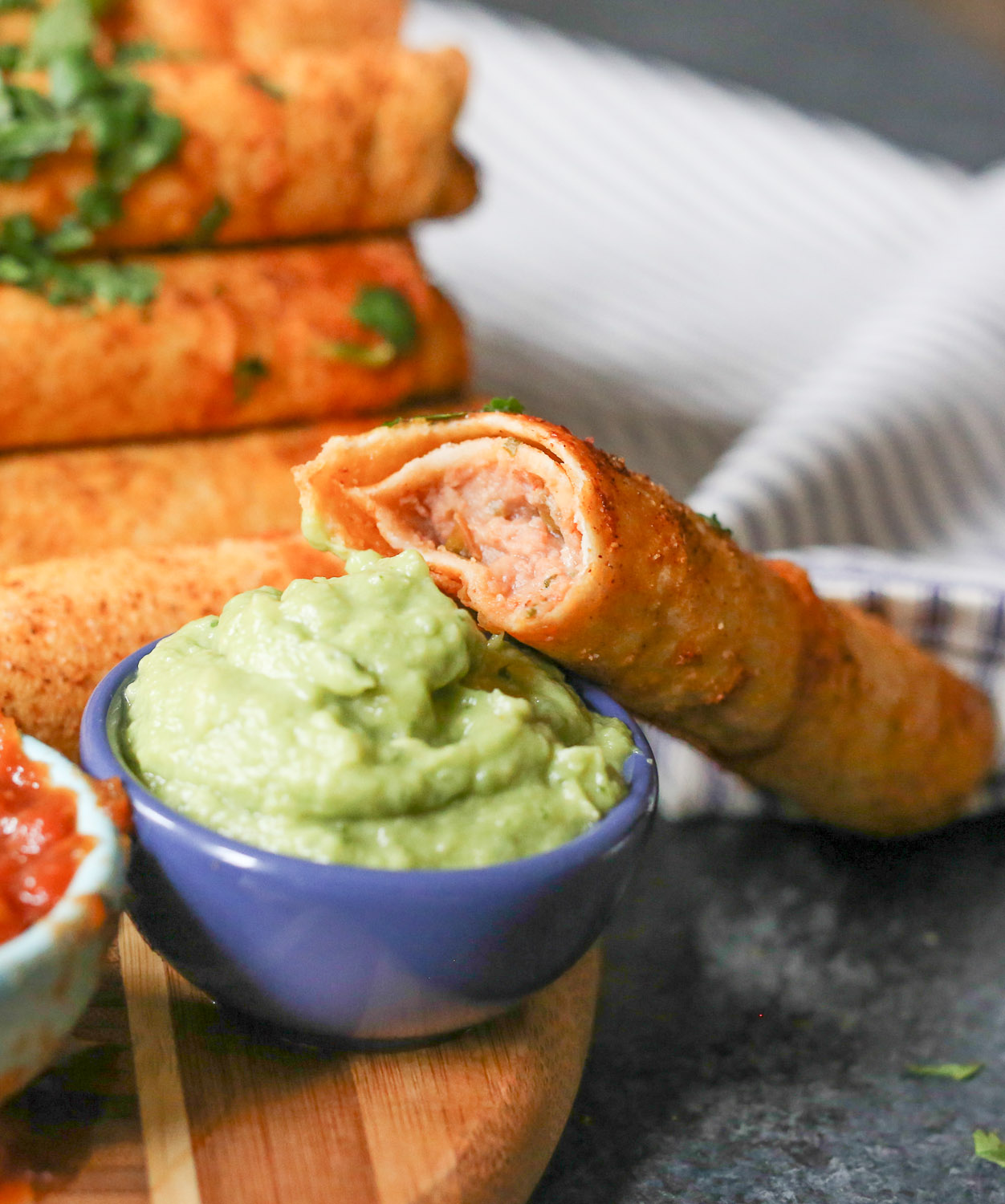 - Pile the taquitos on a serving plate/platter. Drizzle with hot sauce and sprinkle with cilantro (if you like) and serve with guacamole and your favorite salsa.