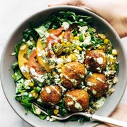 Source notes: This recipe was previously titled “Summer Bliss Bowls with Sweet Potato Falafel and Jalapeño Ranch” but was updated in August 2021 to better reflect and respect the cultural origins from which falafel came from. Falafel is a traditional Middle Eastern food that’s typically made from chickpeas, fava beans, or both, and is fried into a ball or fritter shape. Check out this recipe from Suzy at The Mediterranean Dish to make traditional falafel, step by step!