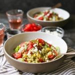I used the Spinach Pesto from The Dude Diet in my rice because my roommate and I love it and always have some on hand in my fridge—it’s delicious, mild and dairy-free/vegan, which makes it both a crowd-pleaser and a little bit lighter than your average pesto. I highly recommend it, but you can obviously use your favorite recipe or a store-bought variety.