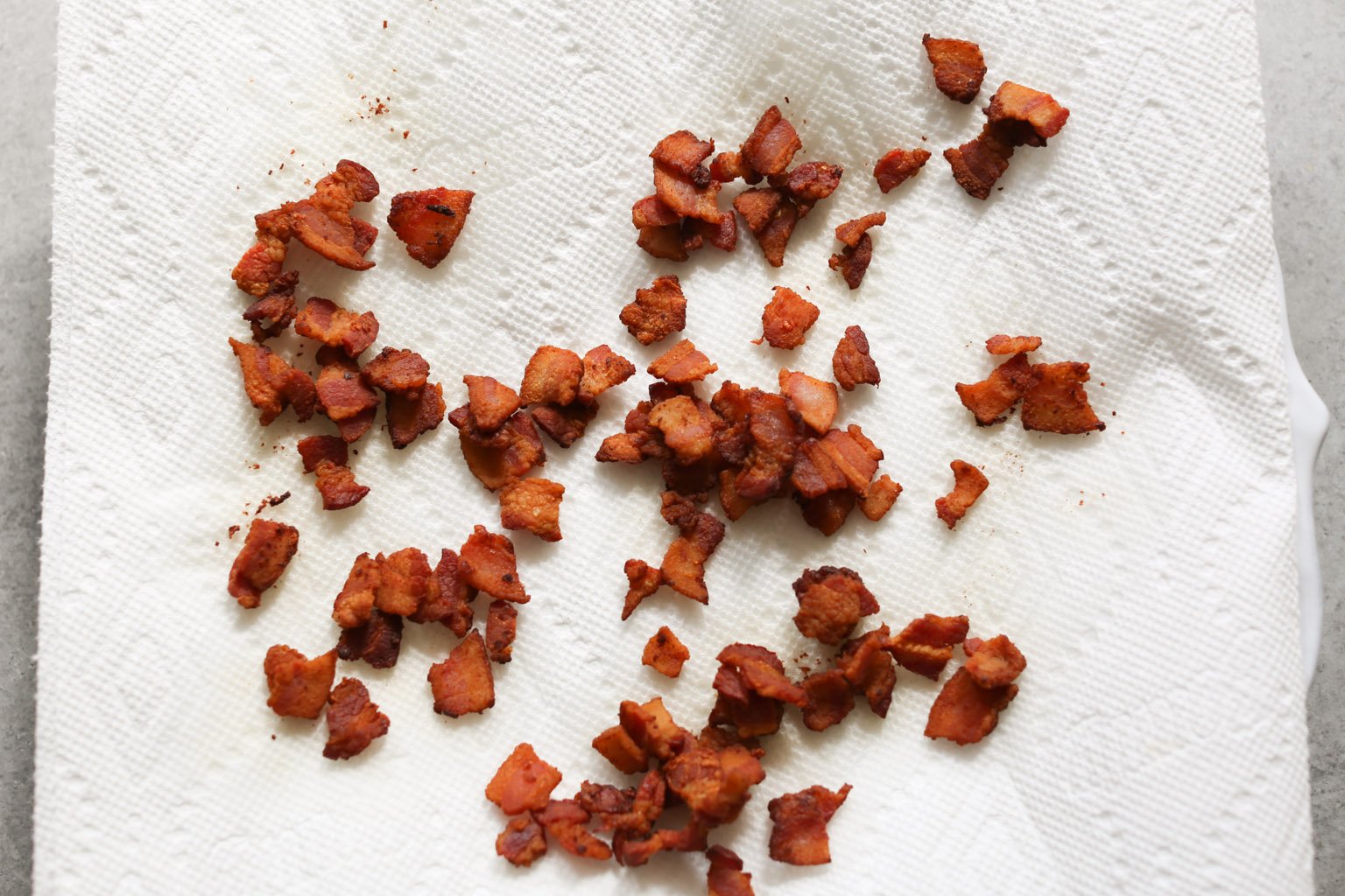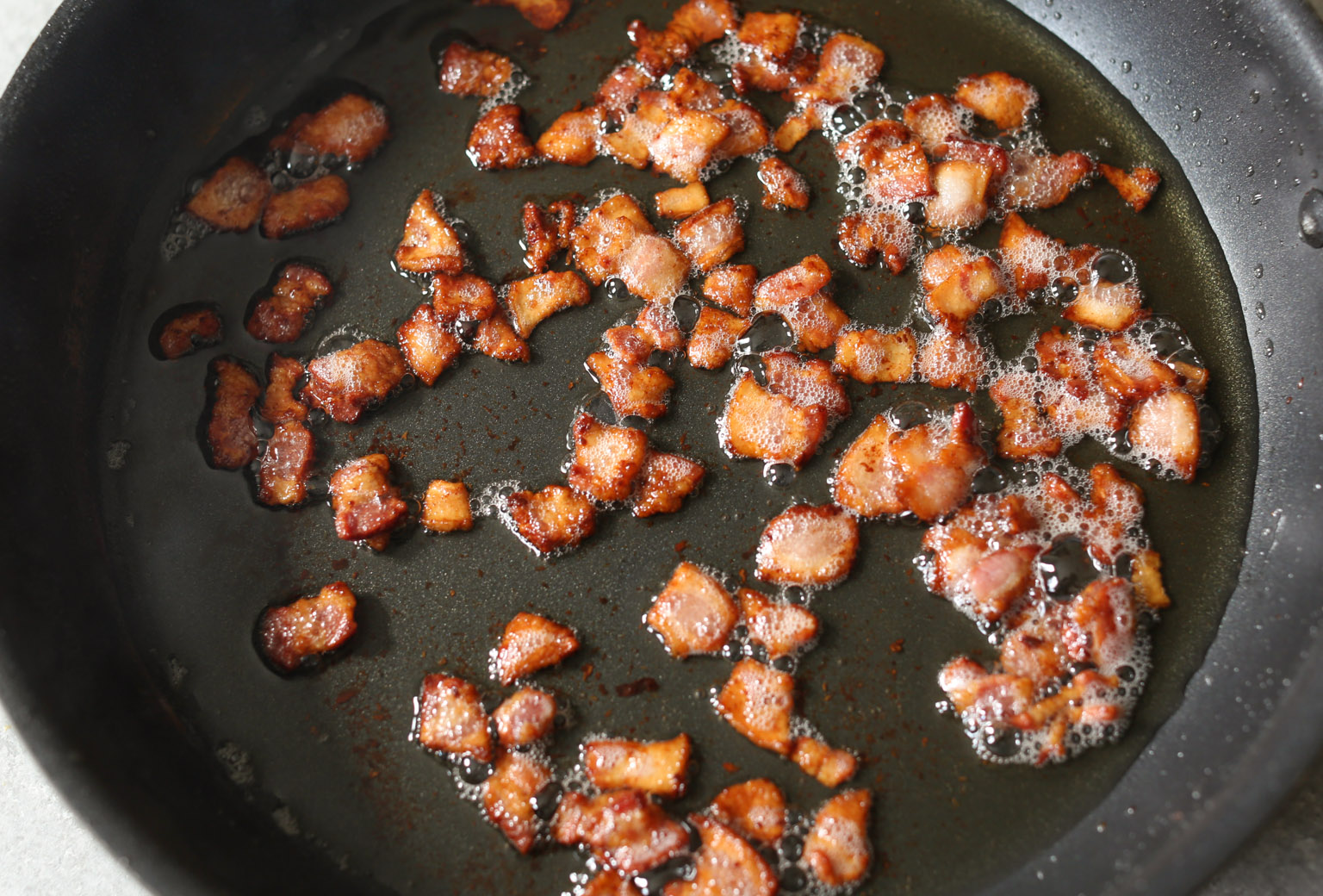 - Heat a large nonstick skillet over medium heat and place a paper towel-lined plate by the stove. When hot, add the bacon and cook until well browned and crispy (about 3-4 minutes). Using a slotted spoon, transfer the bacon to the prepared plate. Pour out all but about 1 tablespoon of bacon grease and return the skillet to the heat.