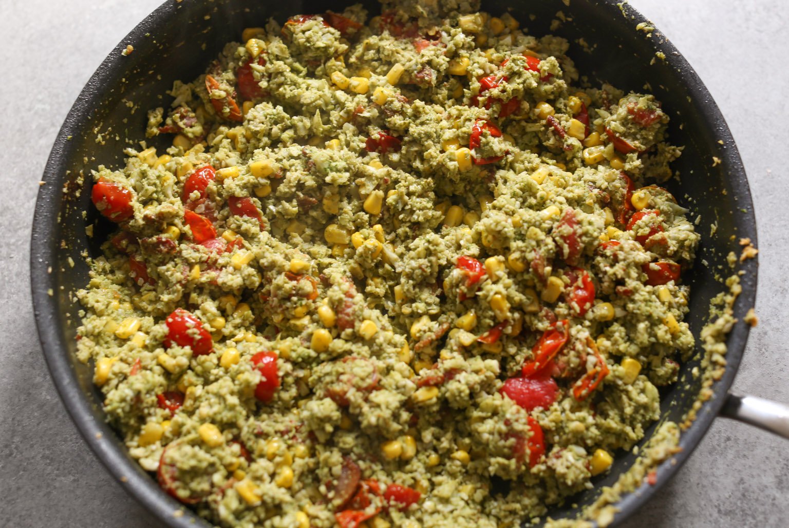 - Add the corn to the skillet and cook for 2-3 minutes until just tender and lightly browned in spots. Set about half a cup of the tomatoes aside. Add the remaining tomatoes to the skillet along with the crushed red pepper. Cook for 1-2 minutes until the tomatoes are just beginning to soften. (Don’t overcook the tomatoes, friends. They’re going to cook more once you add the “rice.”)