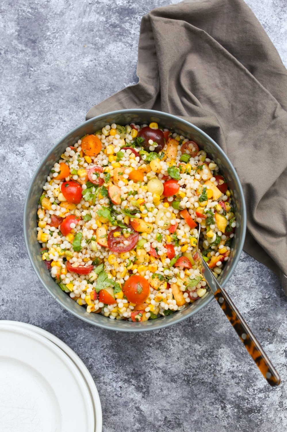 I’ve always gravitated toward grain and pasta salads in general, but they are truly the best packable sides for picnics/bbqs/potlucks, and this Summer Couscous Salad has become my most beloved summer offering. Israeli couscous loaded with peaches, cherry tomatoes, sweet corn, herbs aplenty, and simply dressed with plenty of fresh lemon and olive oil is a wildly versatile, crowd-pleasing summer smorgasbord salad that never gets old. Seriously. I’ve made it at least once a week this entire summer, beach bbq or not, as this sweet and savory staple is equally fabulous as a dinner party side or #sassydesklunch.