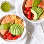 - Assemble your bowls. Divide to the quinoa among 4 bowls. Add a salmon filet and one quarter each of the corn, tomatoes, and avocado to each bowl. Serve the bowls drizzled with plenty of basil vinaigrette.