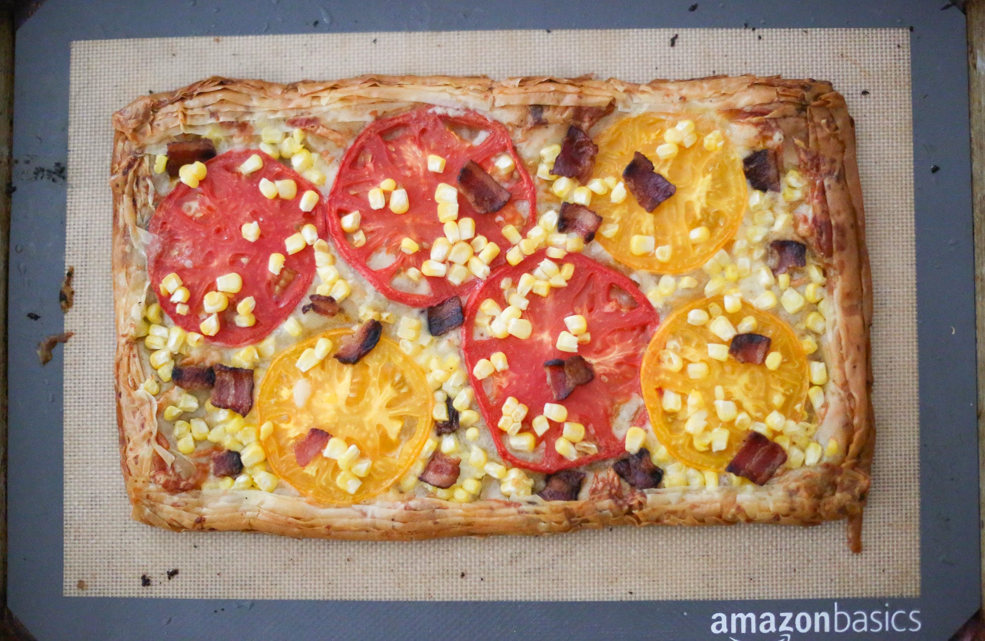 - Sprinkle the cheese on top of the stacked phyllo, leaving a roughly 1-inch border around the tart. Top with tomato slices, corn, and bacon.