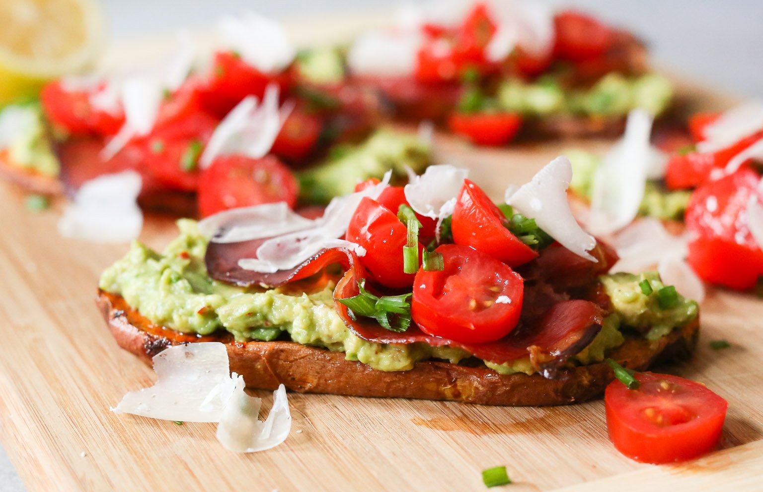 - Assembly time! Spread each sweet potato “toast” with one quarter of the avocado mash. Add a slice of crispy prosciutto and top with the cherry tomatoes, Parmesan, and chives. Serve topped with poached or fried eggs if you like.