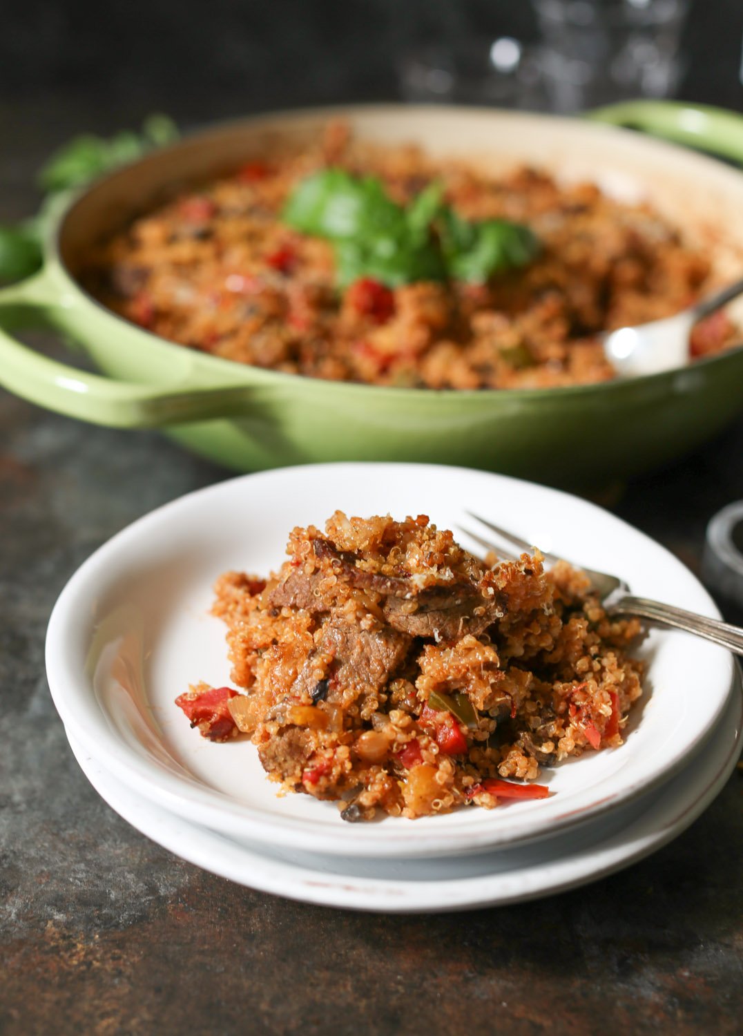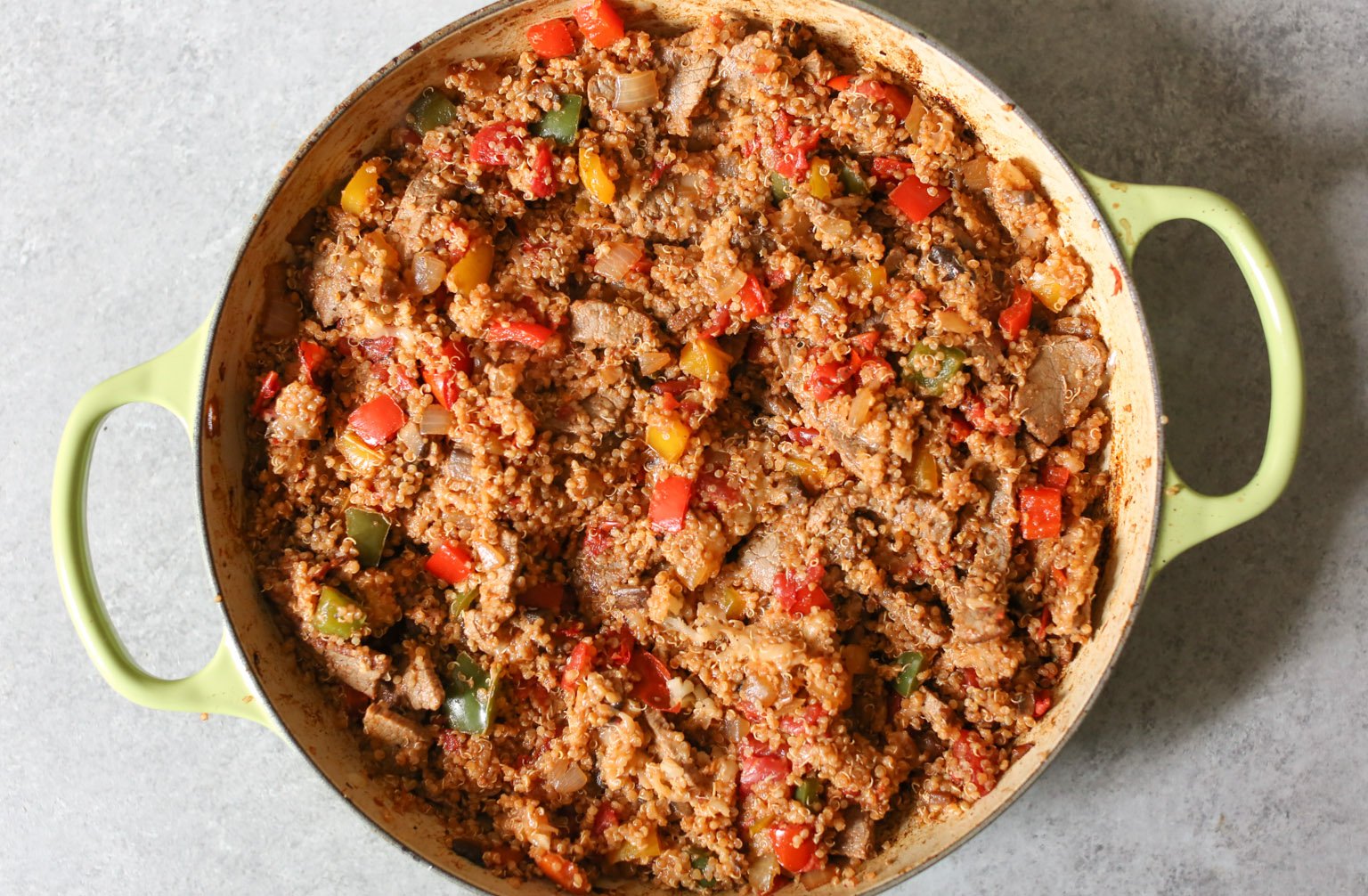 I know I say this about every quinoa bake, but this one might be my best yet? Loaded with thinly sliced steak, sautéed onions, bell peppers, portobellos, marinara, and cheese, it’s got all the beloved flavors of Philly’s dankest hybrid sub. My live-in cheesesteak connoisseur (aka Logan) has now eaten it for three straight days (last night he ate it as a “side” with his chili), and I don’t think I’ve heard such ecstatic grunting since the Cheeseburger Quinoa Bake’s 2015 debut. Great success.