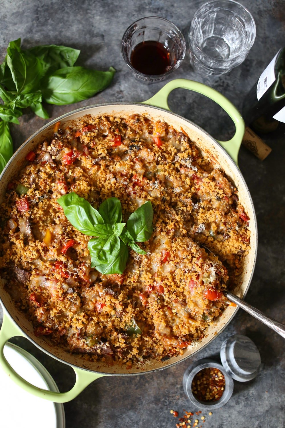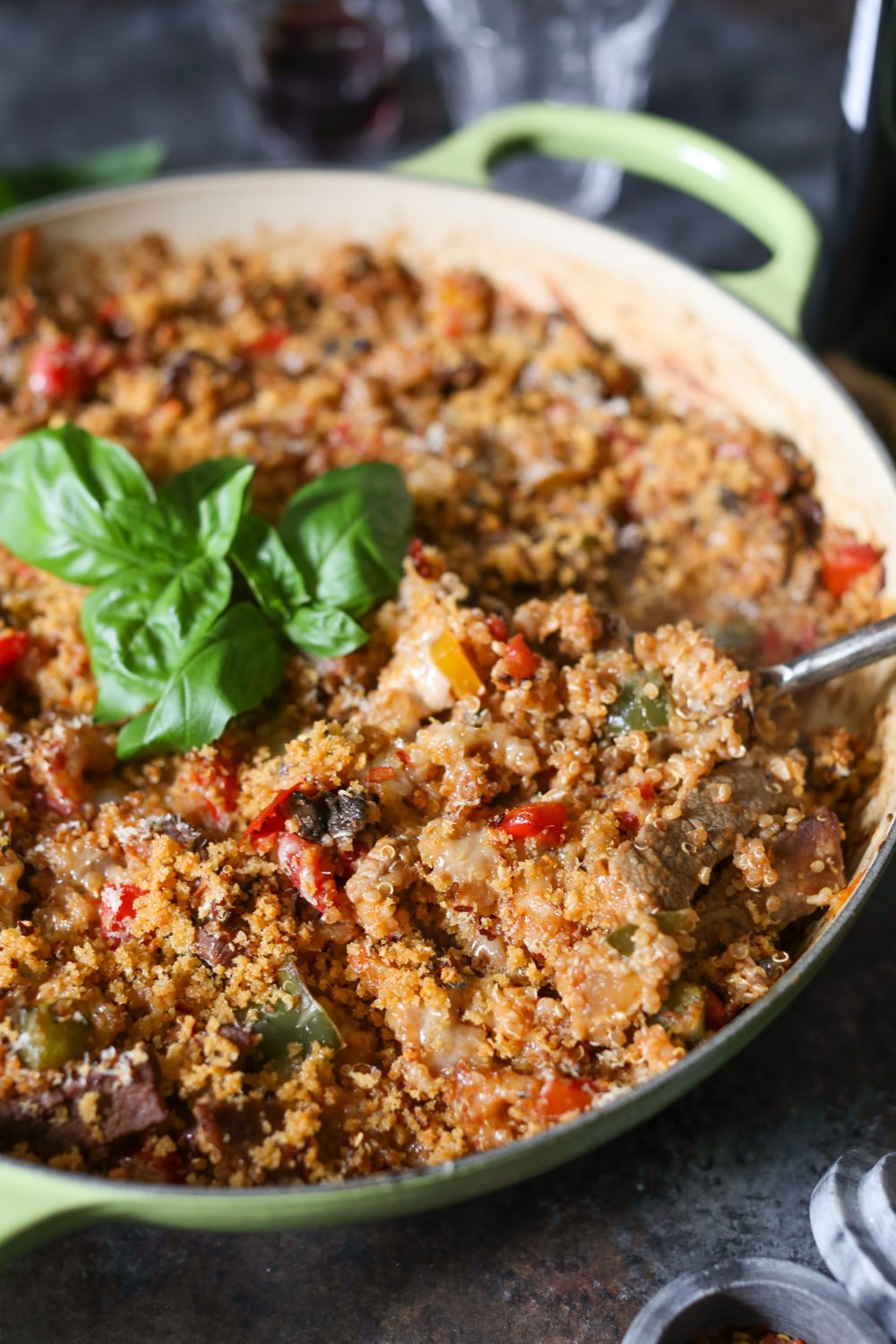 - Return the steak to the pan, then add the cooked quinoa, marinara, and 1 cup of the grated Provolone. Fold everything together until well combined. Taste the filling and season with extra salt and pepper if necessary. Gently smooth the top of the filling, then sprinkle it with the remaining Provolone and the Parmesan cheese and top with the prepared panko mix.