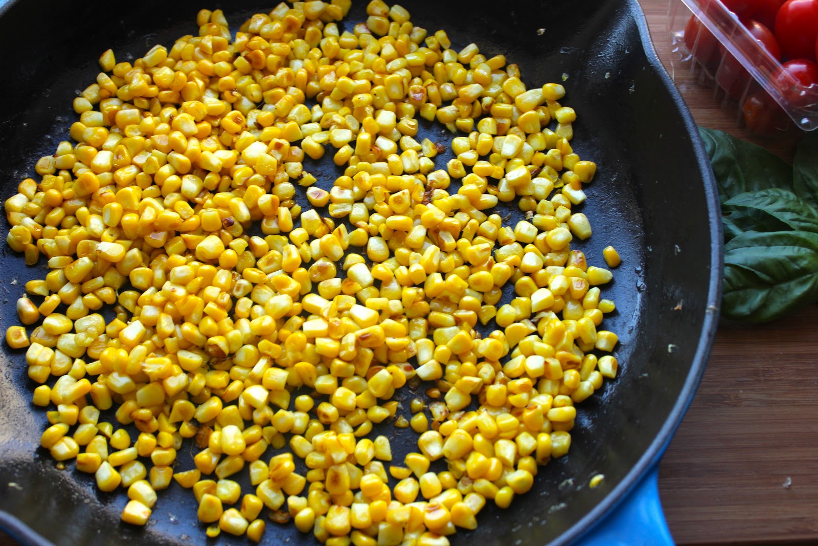 - Heat 1 tbsp olive oil in a cast iron skillet. When hot, add the corn and sauté for 8-10 minutes until the corn is tender and well browned. Transfer the cooked corn to a large mixing bowl and let cool to room temperature.