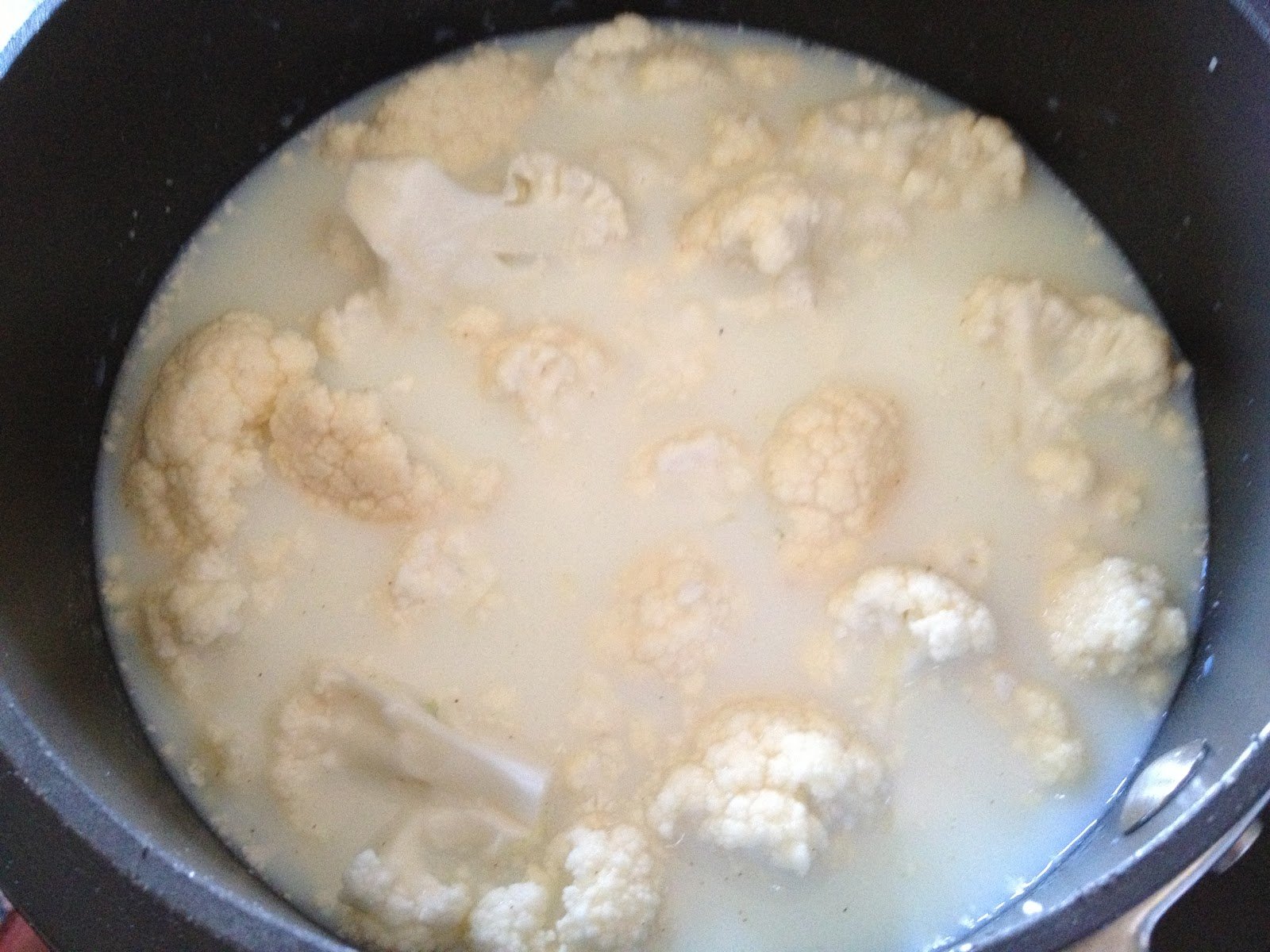 -Put the cauliflower and milk in a medium-sized pot. Bring to a simmer. Simmer covered for about 15 minutes until the cauliflower is very tender.